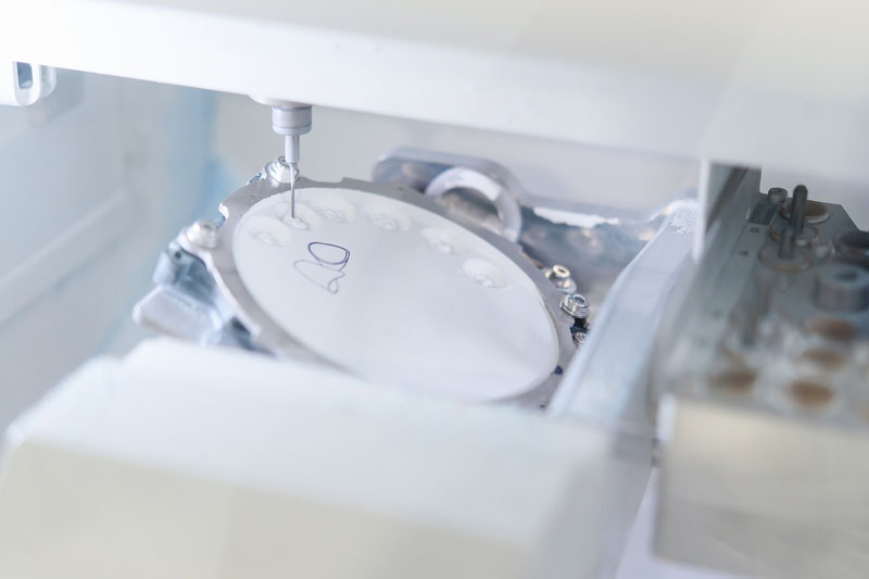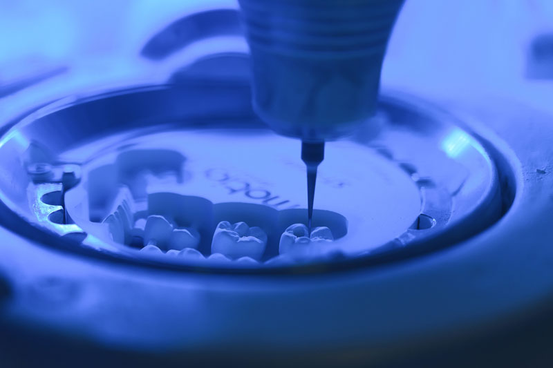 設計データをもとに、ミリングマシン(削り出し機)や3Dプリンターで補綴物を加工します。主に使用される材料は、ジルコニア、セラミック、レジン(樹脂)などです。